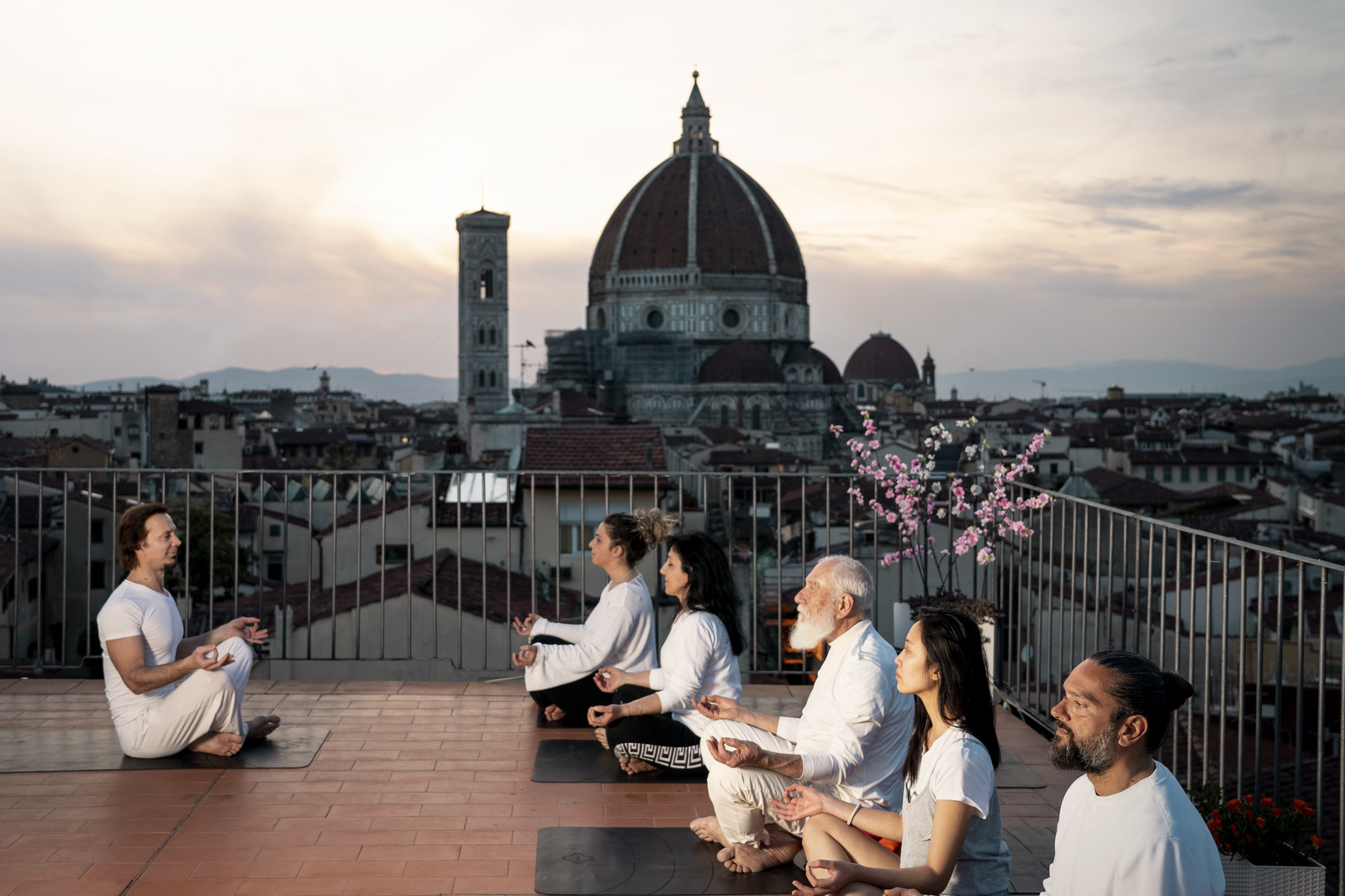 Experience Florence like never before with a magical sunset yoga session on our 360° rooftop, surrounded by breathtaking panoramic views of the city’s iconic skyline. As the golden hour bathes the Duomo, Tuscan hills, and ancient rooftops in a warm glow, you’ll flow through a gentle yoga practice designed to relax, restore, and inspire.